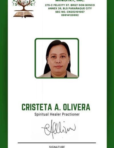 Sis. Cristy Olivera, sekretářka soukromé společnosti, má bohaté zkušenosti v tradičních filipínských léčebných postupech. Po téměř tři desetiletí pomáhá jednotlivcům dosáhnout duchovní, duševní a fyzické pohody. Spojuje tradiční znalosti s moderními celostními principy, aby poskytovala komplexní řešení zdravotní péče a celkové pohody. S touto praxí se seznámila v roce 1998 a tehdy byla vysokoškolskou studentkou oboru lékařský laborant, když čelila významné zdravotní výzvě, kterou běžné léčebné postupy nedokázaly plně řešit.