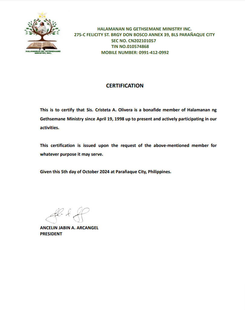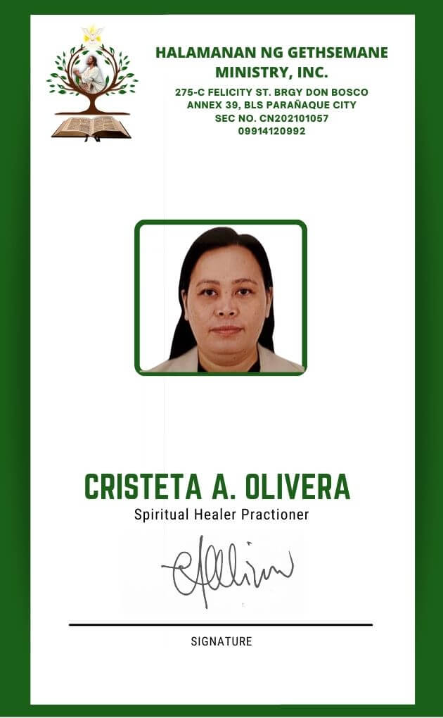 Sis. Cristy Olivera, sekretářka soukromé společnosti, má bohaté zkušenosti v tradičních filipínských léčebných postupech. Po téměř tři desetiletí pomáhá jednotlivcům dosáhnout duchovní, duševní a fyzické pohody. Spojuje tradiční znalosti s moderními celostními principy, aby poskytovala komplexní řešení zdravotní péče a celkové pohody. S touto praxí se seznámila v roce 1998 a tehdy byla vysokoškolskou studentkou oboru lékařský laborant, když čelila významné zdravotní výzvě, kterou běžné léčebné postupy nedokázaly plně řešit.